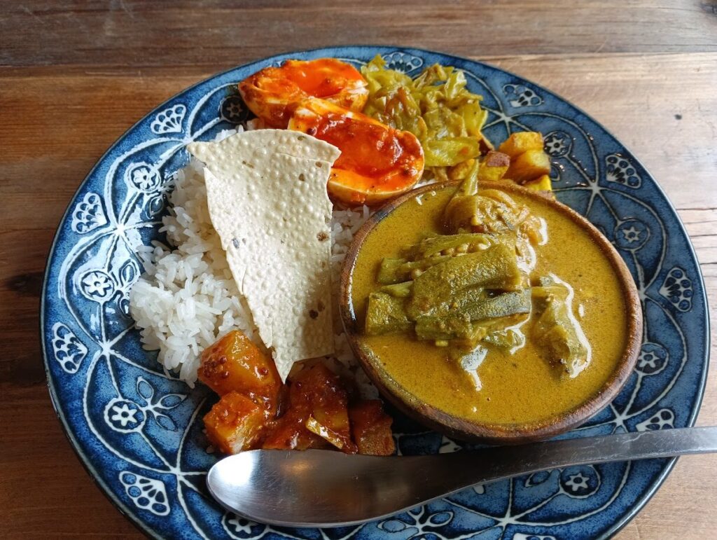 Mさんと食べた、スパイスわがんせのカレー。イカとおくらのココナッツカレーにスパイシー煮玉子のせ。中之条町のつむじカフェに入ってます。