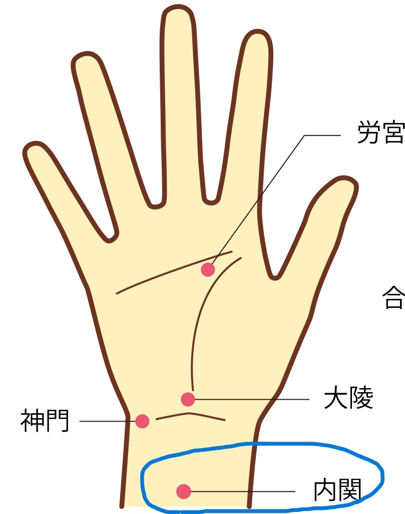 このままだと乗り物酔い一直線を察知した私は、試しに座席を端に移動してみた。さっきよりは幾分マシ、かもしれない。そして、鍼灸師ならこんな時に必ず使うテッパンツボ、「内関」に円皮鍼を貼る。