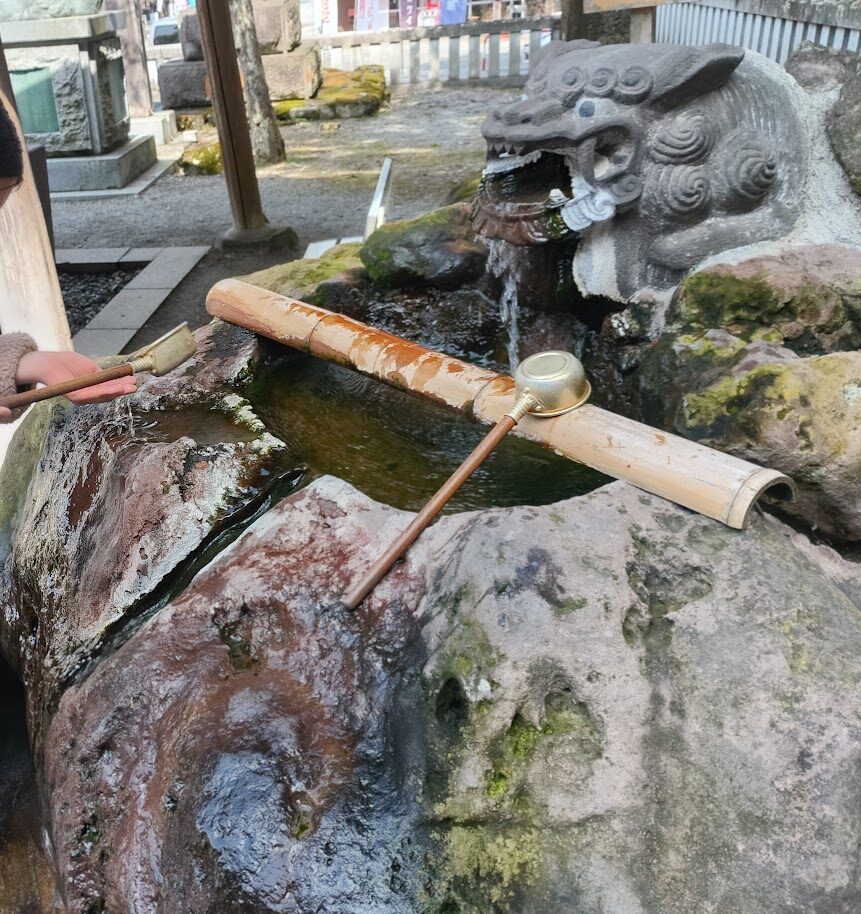 手水からは温泉が。