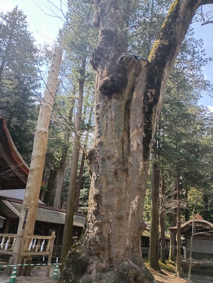 話しかけてきそうな巨木。その隣には、御柱!