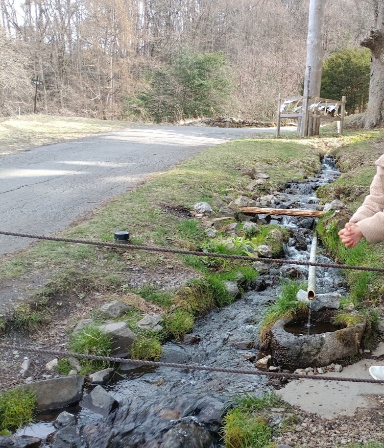 水眼の泉と、後方に見えるは御柱。水が冷たくて気持ちいい。