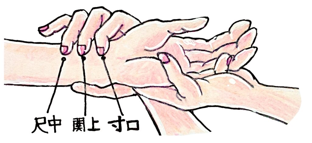 皆さんも、ぜひ自分の脈で試してみて欲しい。左の寸口が心で、関上が肝で、尺中が腎だ。